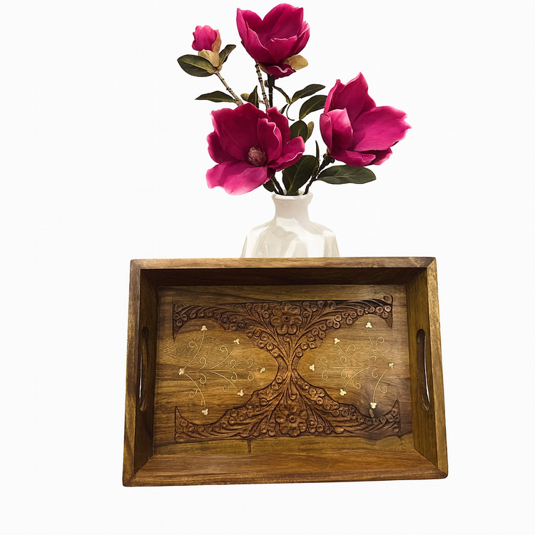 سینی چوبی کنده کاری شده و برنز کوب شده است، صنایع دستی هندوستان میباشد و از چوب گران قیمت و بسیار زیبای رزوود هندی ساخته شده است